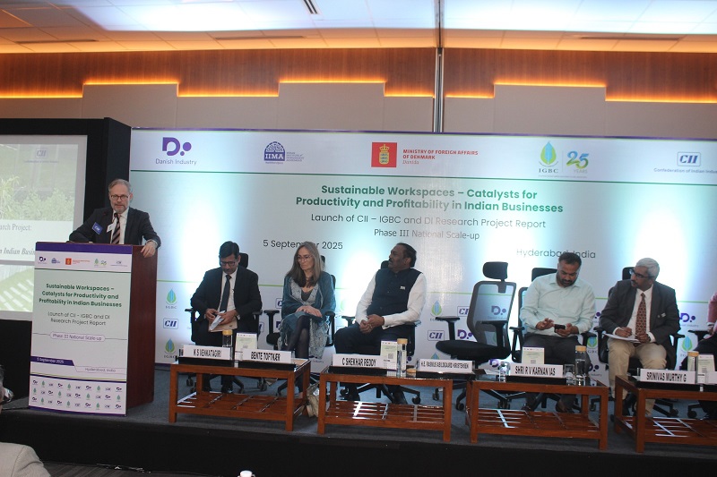 The Confederation of Indian Industry (CII) – Indian Green Building Council (IGBC), in collaboration with the Confederation of Danish Industry (DI), today launched the landmark research report “SUSTAINABLE WORKSPACE – Catalyst for Productivity and Profitability in Indian Businesses” at the CII Green Business Centre, Hyderabad.